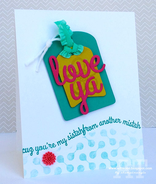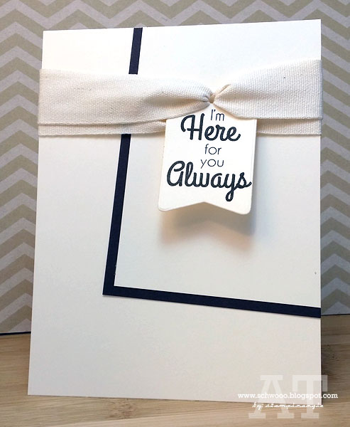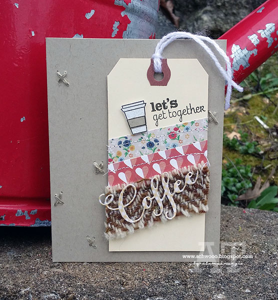 To put it together, I attached the ribbon on a tag made with the CAS-ual Fridays Stamps Scallop Tag Fri-Dies with a couple of small glue dots, then tied the tag on with some sweet twine. *Hopefully* it will be easy to remove and wear. Oh, I also used the Scallop Tag Fri-Dies with some silver glitter washi tape for a little extra shine along the bottom.
