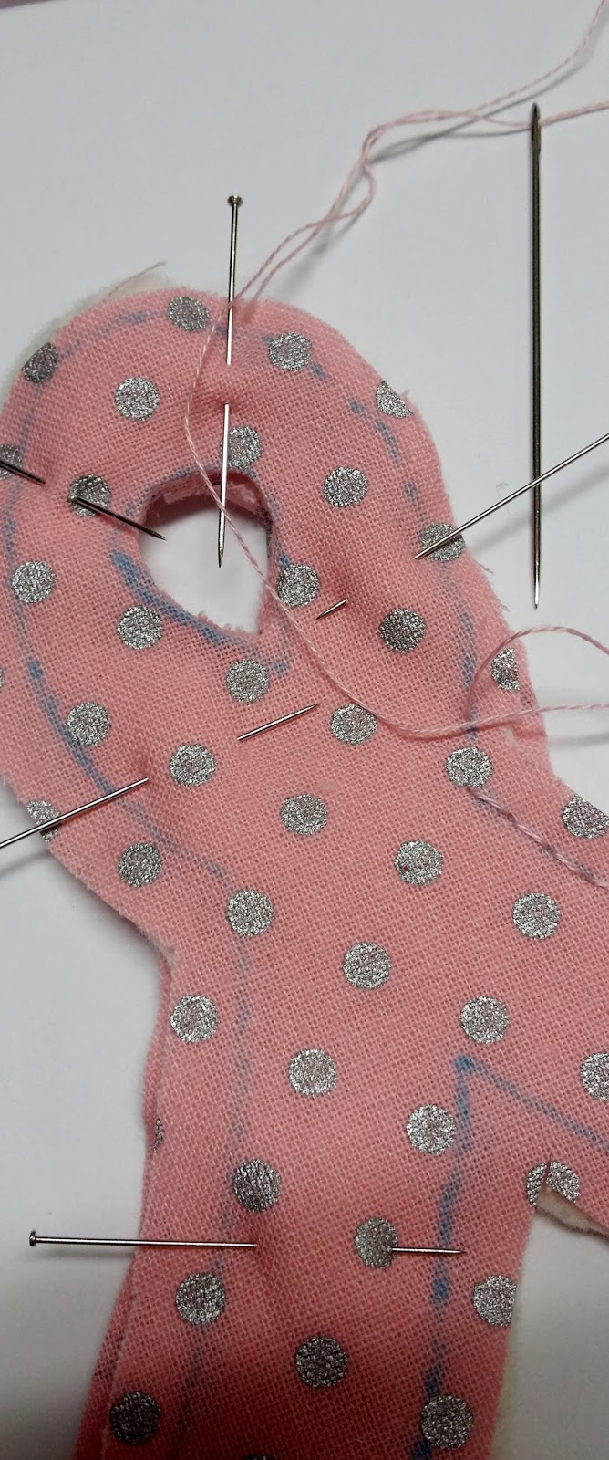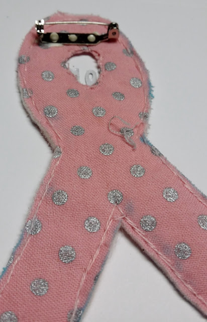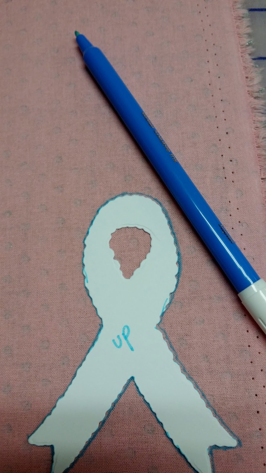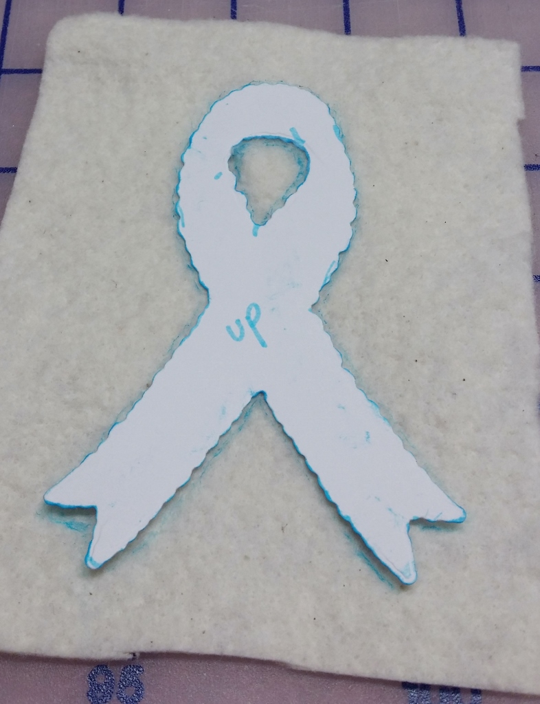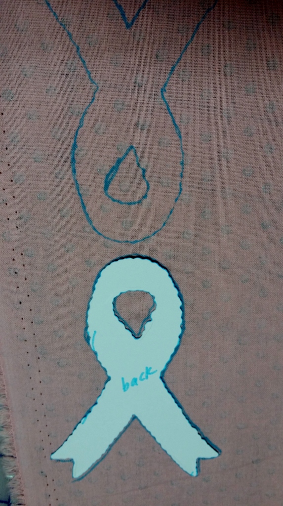 I made a cardstock pattern with the Hope Ribbon die and traced it on the back side of the fabric and quilt batting with a washable marker: