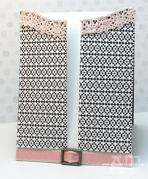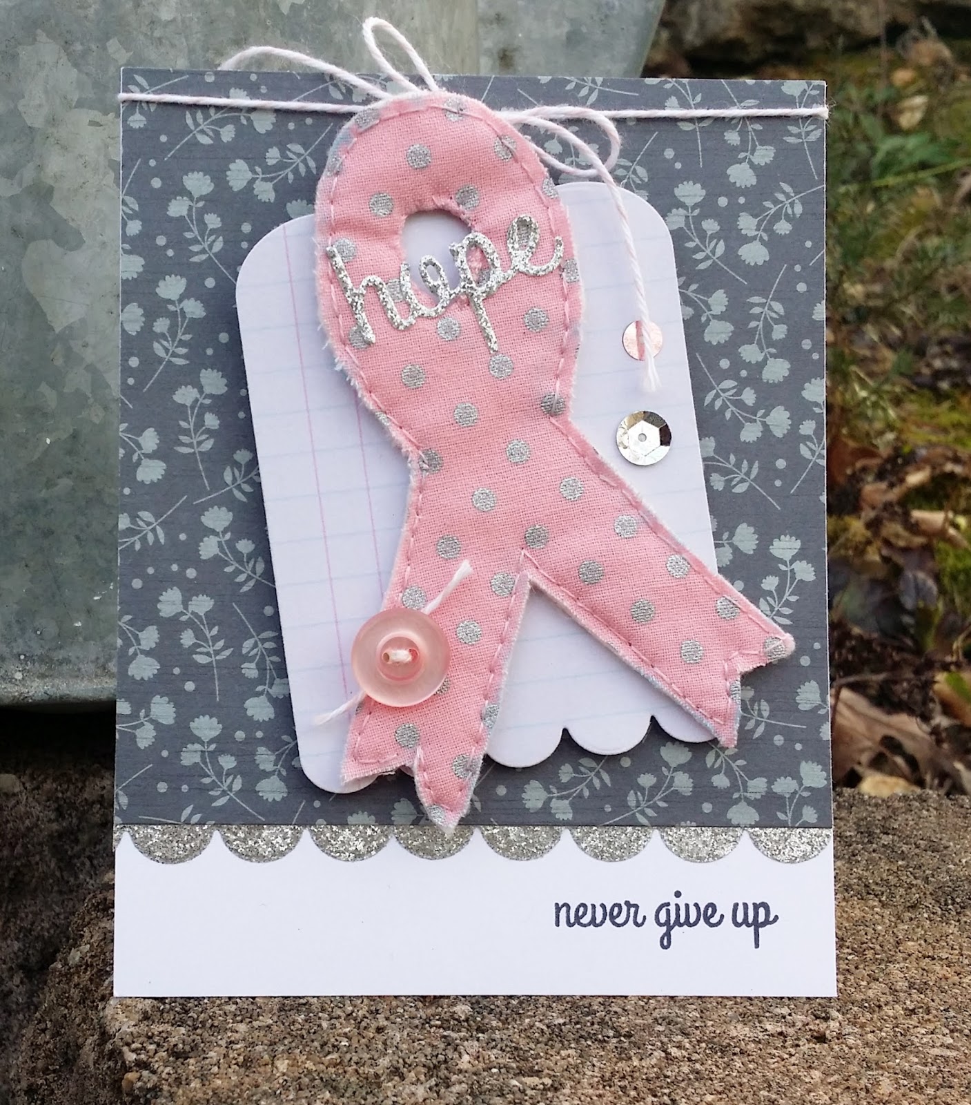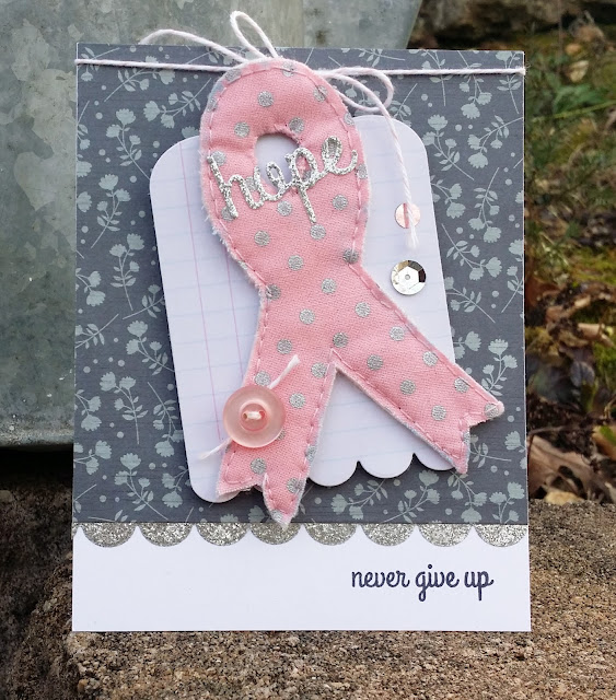 Accessories: CAS-ual Fridays Stamps Ruffled Ribbon & Scallop Tag Fri-Dies, Big Shot, pink fabric, quilt batting, needle/thread, pink button, sequins, Heidi Swapp silver glitter tape, pink/white twine.
